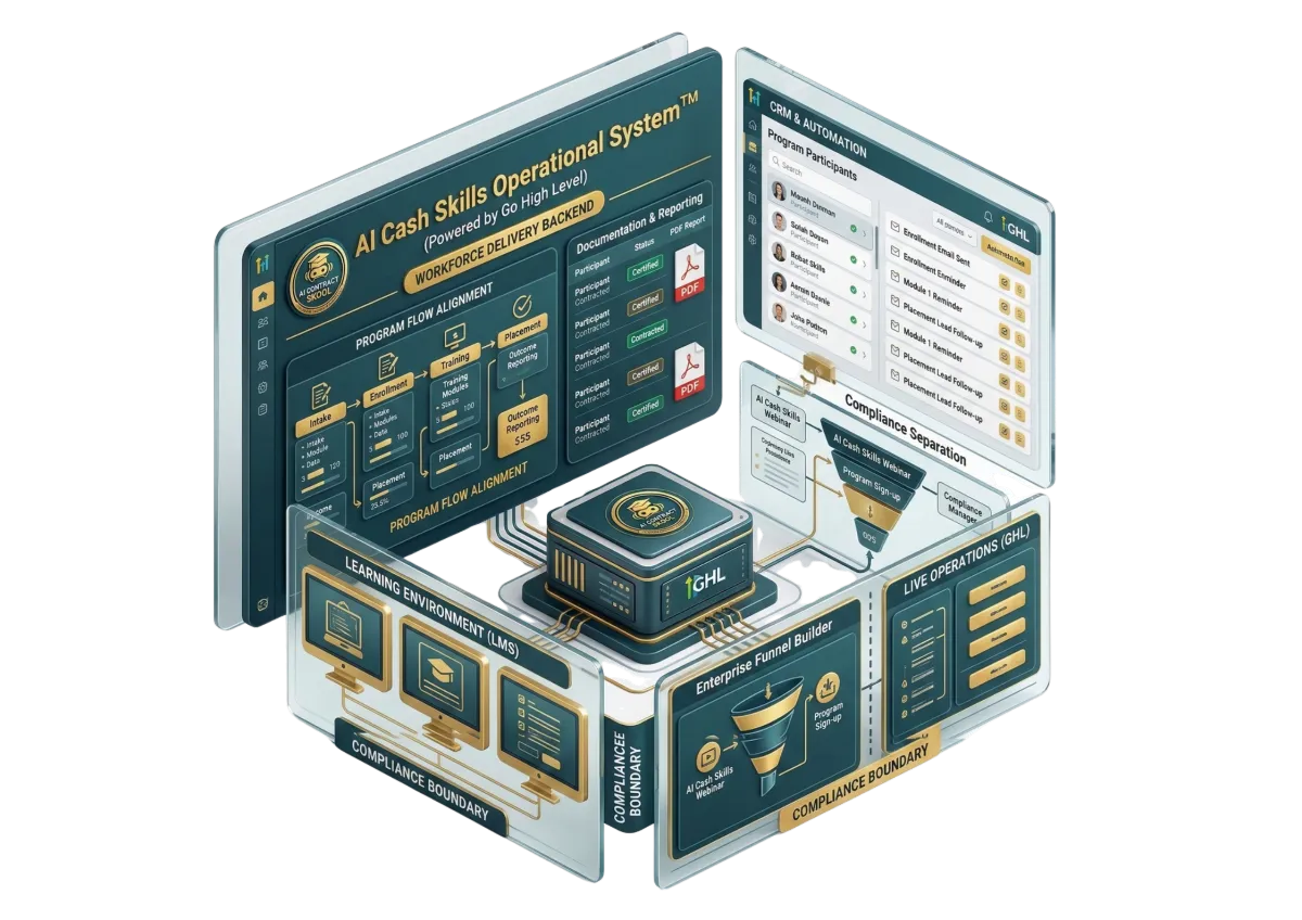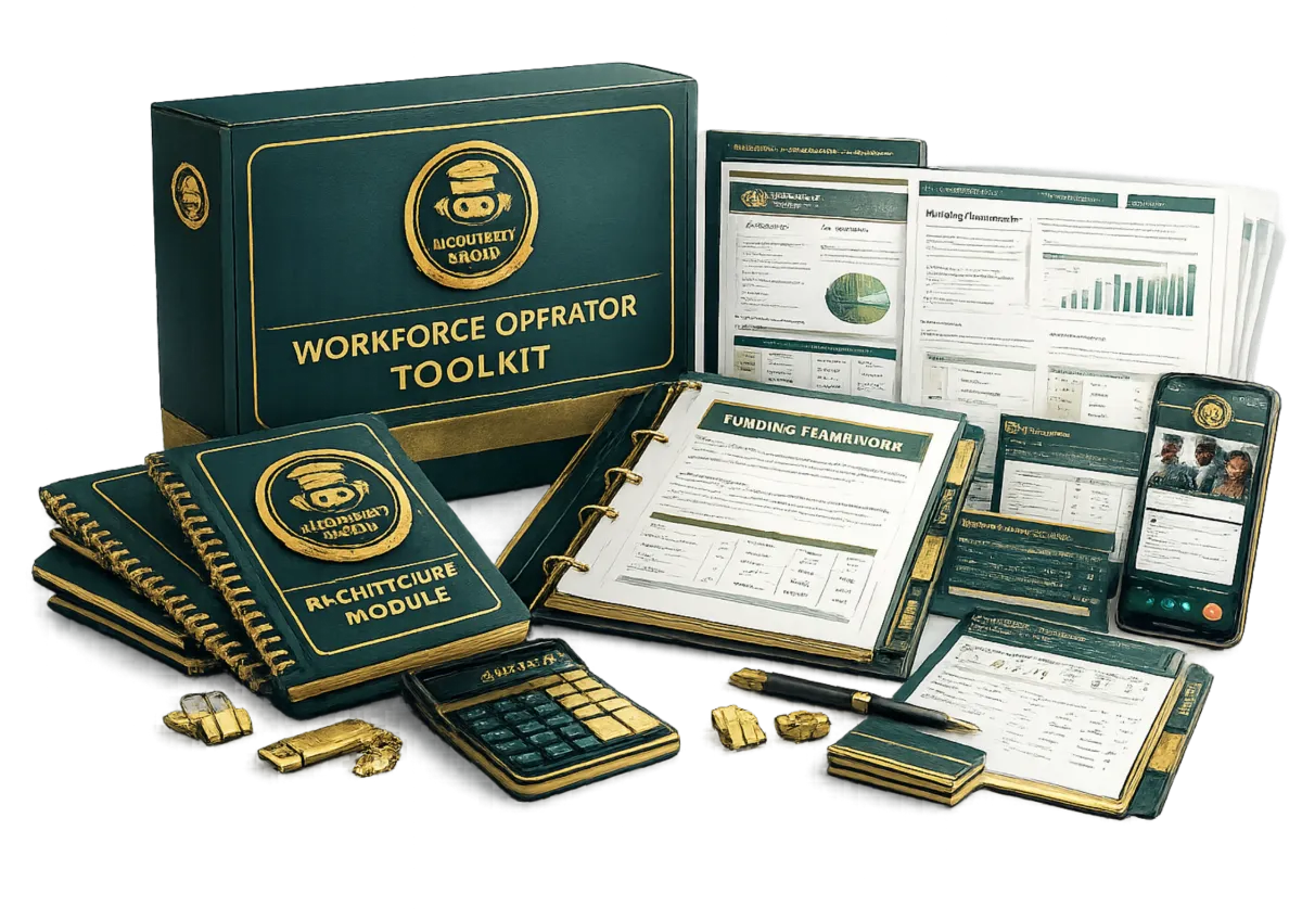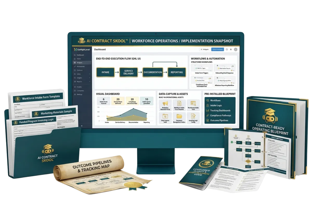 A contract-ready operating blueprint pre-installed inside your system — structured workflows, intake logic, tracking dashboards, compliance pathways, and outcome pipelines built from real workforce contract execution.
